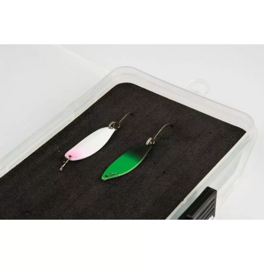 Această cutie servește pescuitul modern și precis în toate elementele sale: protejează momelile artificiale mici și valoroase, oferind în același timp acces rapid la ele. Dimensiunea mică și greutatea redusă se potrivesc perfect stilului pescarului activ de spinning, unde fiecare gram și fiecare secundă contează. Plasticul rezistent la uzură suportă utilizarea regulată pe termen lung și nu se deschide accidental în geantă. Capacul transparent ajută la identificarea rapidă a momelii, astfel încât nu este nevoie să pierdem timp căutând. Pe scurt: un partener inteligent, eficient și fiabil pentru orice aventură pe malul apei.