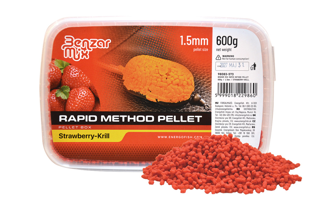 Conținutul pachetului:Benzár Mix Rapid Method Pellet 1,5mm Eper-Krill Pellet Box 600gr