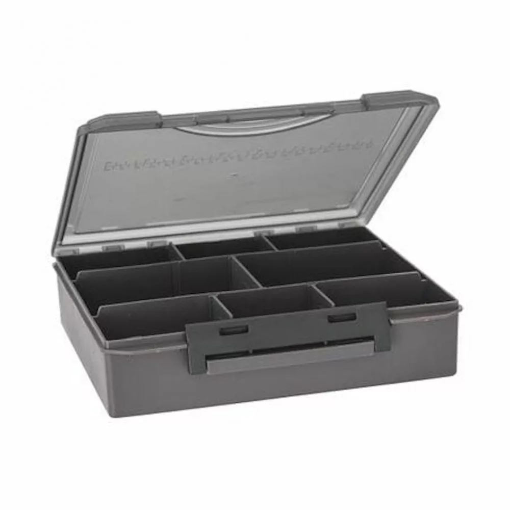 O cutie de 23 x 20 x 6 centimetri, concepută pentru depozitarea organizată a echipamentului, a cărei compartimentare internă poate fi ajustată după preferință. Pentru depozitarea accesoriilor mici, a cârligelor, agrafelor și vârtejelor, avem la dispoziție 4 cutii de 10 x 6.5 x 2.5 centimetri, care au trei, patru, șase sau, respectiv, opt compartimente. Atât cutia mare, cât și cele mici sunt prevăzute cu o închidere rezistentă, care le permite să fie sigilate perfect. Materialul este masiv, iar capacul transparent are o scară de măsurare practică. Este o alegere excelentă pentru orice pescar căruia îi place să-și păstreze echipamentul în ordine și într-un mod transparent.