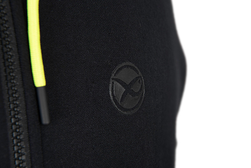 Practical details further enhance the utility of the hoodie. The flexible, ribbed cuffs and waistband help to retain warmth while preventing cold air from entering. The zippered, sherpa-lined pockets not only keep hands warm but also offer a secure storage place for smaller tools or personal items. The lime-colored drawstring and zipper pull not only visually brighten the hoodie but also ensure easy handling, even with gloves. The subtle, black rubber Matrix logos give the garment an elegant yet sporty look.