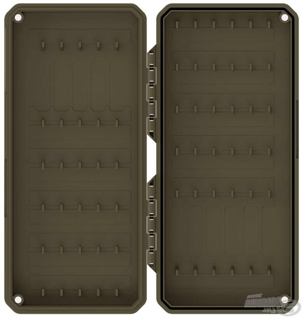 Cutia este fabricată din plastic PC + ABS, un material de înaltă calitate, rezistent la șocuri și intemperii. Acest lucru asigură o durată lungă de viață chiar și în cazul utilizării intensive. Cutia se închide etanș cu patru magneți puternici, astfel încât monturile depozitate în interior rămân protejate de umiditate, murdărie și rugină – ceea ce este deosebit de important dacă depozităm cârlige pre-legate în ea.
