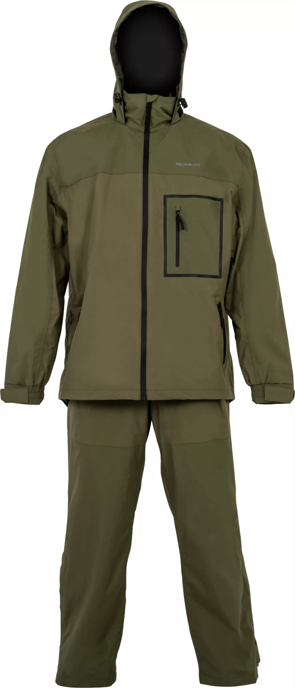 Costumul Korum Superseal Waterproof Suit este un ansamblu de îmbrăcăminte de ploaie special conceput pentru nevoile pescarilor. Oferă protecție fiabilă împotriva vremii schimbătoare, menținând purtătorul uscat și confortabil chiar și în timpul partidelor lungi de pescuit. Setul este format din două piese: o jachetă impermeabilă și o pereche de pantaloni cu bretele Bib&Brace, care împreună asigură o protecție completă împotriva ploii, vântului și frigului.